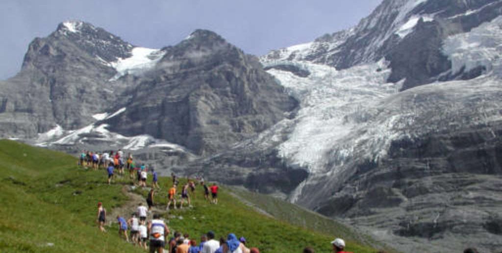 c. Der Jungfrau Marathon im Berner Oberland: Die angeblich schönste Marathonstrecke der Welt fasziniert immer mehr Läufer durch die alpine Bergkulisse. Das spiegelt sich auch in den Auszeichnungen wieder, denn die Veranstaltung wurde 2012 und 2013 zu dem Marathon des Jahres gewählt. Die Läufer müssen eine Strecke von 1829 Höhen- und 42 Kilometern zurücklegen. Ziel ist die Passhöhe Kleine Scheidegg auf 2100 Metern. Der Streckenverlauf sowie weitere Informationen bezüglich des Marathons sind hier einsehbar. Obwohl die Läufer die grossen Höhenunterschiede meistern müssen, liegen die Richtwerte für die Männer bei 2 Stunden 25 Minuten und für die Frauen bei 2 Stunden 53 Minuten. Wie begehrt die Teilnahme an diesem Lauf ist, zeigen die Anmeldezahlen, denn bereits zwei Tage nach der Eröffnung der Online-Anmeldung waren 3000 Startplätze ausgebucht.