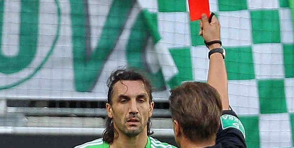 Den ersten großen Aufreger der Begegnung gab es dann kurz vor dem Halbzeitpfiff, als der Wolfsburger Kyrgiakos nach einer Notbremse gegen den Israeli Itay Shechter die Rote Karte von Schiedsrichter Thorsten Kinhöfer (Herne) gezeigt bekam. Der Grieche hatte seinen Gegenspieler nach einem langen Pass am Trikot gezogen, jedoch fiel der Lauterer auch theatralisch.